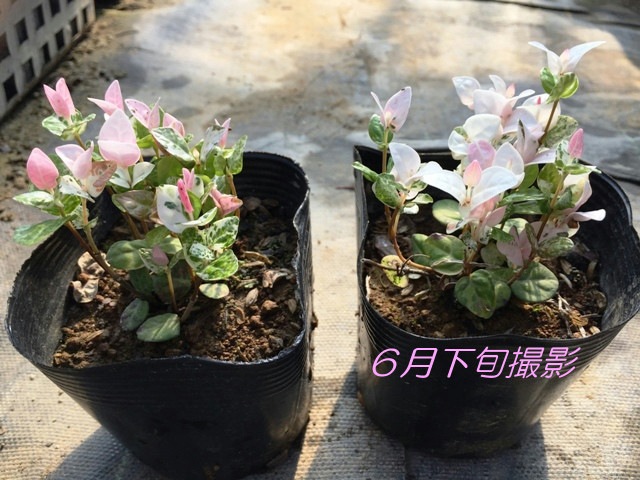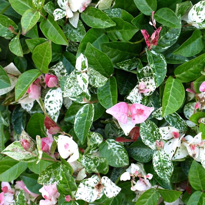 ピンク、白、緑のコントラストが美しい常緑つる植物。